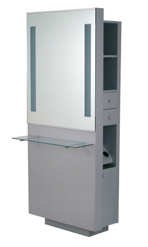 Loading... Please wait...The Belvedere OP252 Opal single station with shelf features a lighted, half-length mirror with 2 fluorescent lamps above a glass work shelf. All storage is on the side and includes, open upper storage, 2 drawers, a tool panel, and a door for storage. Other side includes a coat hanger for storage. Unit has a quadplex for electrical (to be hard-wired on site). Wall mounted with mounting cleats keeps the station secure against the wall.